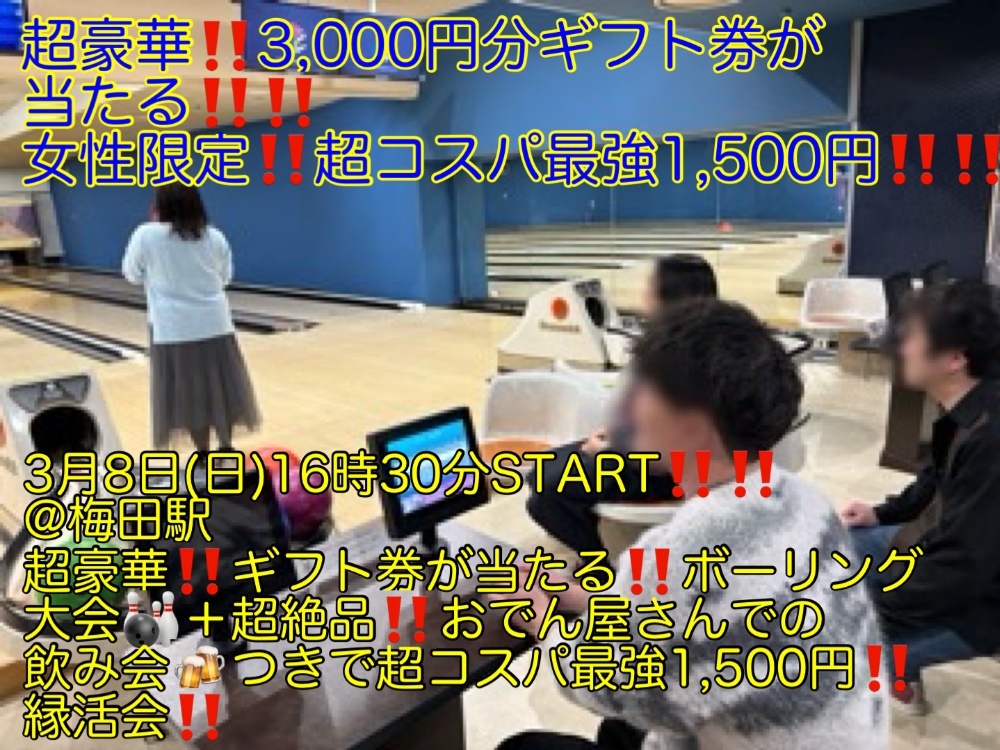 超豪華‼️3,000円分のギフト券が当たる‼️ボーリング大会🎳+超絶品おでん屋などコース料理8品+お酒の飲み放題がついて、女性限定‼️‼️超コスパ最強‼️‼️1,500円‼️‼️でイベントを開催いたします‼️‼️